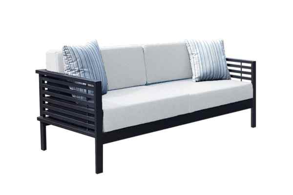 Breeze outdoor furniture is upholstered with Sunbrella fabric or leather that is suitable for outdoor usage throughout the whole year. This furniture is not designed to be 100% waterproof, but it let’s water through as quickly as possible. By using breathable materials, we ensure a constant air circulation inside our furniture. This makes it possible that after heavily rain the furniture can dry completely after 30 minutes. The clean lines and the gorgeous aluminum horizontal slats of the Breeze collection are available in black or white settings.